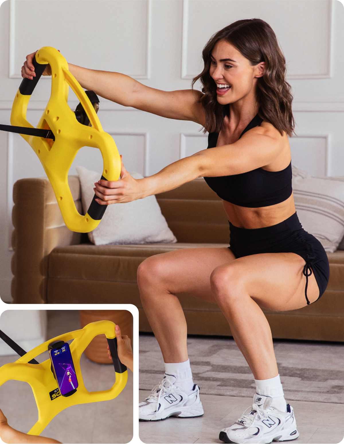 Imagine doing squats without big bulky weights.With Stealth Squat, you use your body weight and gravity to target your legs, glutes, back and arms while playing games, giving you a fun full-body strength workout.